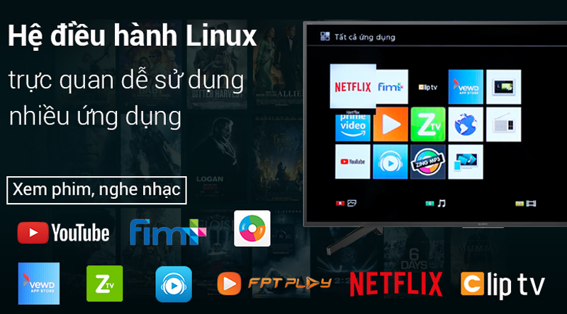 Smart Tivi Sony này được trang bị các ứng dụng quen thuộc như: FPT Play, Fim+, Zing Mp3, Zing TV,...