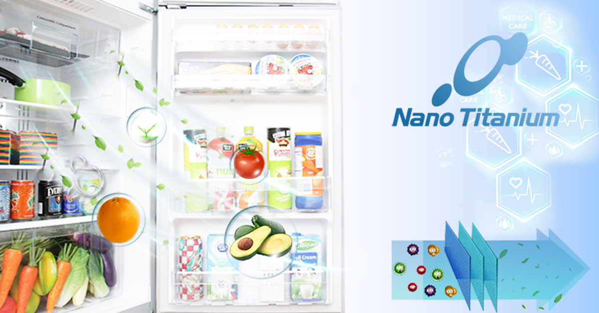 Công nghệ kháng khuẩn, khử mùi Nano Titanium loại bỏ nhanh chóng các mùi khó chịu do thực phẩm gây ra đồng thời còn giúp tủ lạnh loại bỏ các vi khuẩn gây hại góp phần giữ nguyên hàm lượng dinh dưỡng bên trong thực phẩm, an toàn với sức khỏe người dùng.