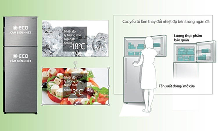 Tủ lạnh R-H350PGV7-BBK còn được tích hợp cảm biến nhiệt ECO riêng cho ngăn đá và ngăn lạnh, theo dõi nhiệt độ hiệu quả cho từng ngăn và duy trì nhiệt độ phù hợp.