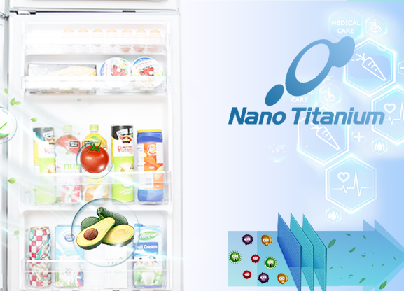 Bạn sẽ yên tâm hơn về môi trường bên trong tủ lạnh với màng lọc Nano Titanium, bộ lọc với chất xúc tác TiO2 sẽ luân chuyển không khí qua màng lọc cấu tạo bởi những phân tử này sẽ bắt và tiêu diệt hiệu quả vi khuẩn vốn có kích thước lớn hơn 1000 lần, đồng thời lọc sạch nấm mốc, mùi hôi.