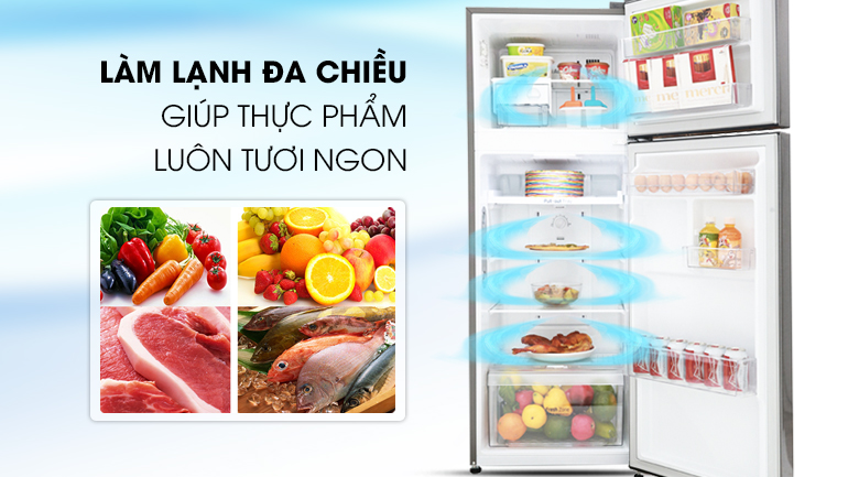 Nhờ vào hệ thống khí lạnh đa chiều, thực phẩm sẽ được bảo quản lạnh đồng đều và hiệu quả hơn ngay cả khi thức ăn chứa đầy bên trong tủ bởi do hơi lạnh được tỏa ra theo các hướng thông minh là chính diện, hai bên hông và cánh tủ, giúp các thực phẩm luôn trong tình trạng tươi mới.