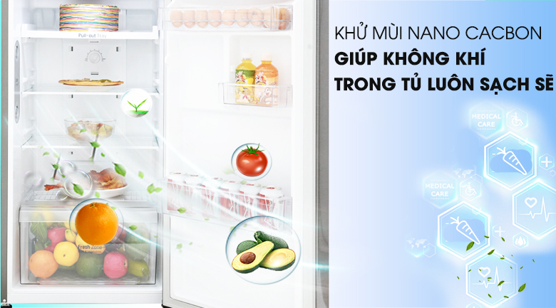 Trang bị công nghệ Nano Carbon có khả năng diệt khuẩn, khử mùi hiệu quả nhờ vậy giúp thực phẩm trong tủ lạnh LG luôn được bảo quản một cách tốt nhất, không bị bám hay lẫn mùi thực phẩm. Hơn nữa, lúc mở tủ bạn sẽ có cảm giác mát lạnh thoải mái, không có mùi hôi khó chịu.