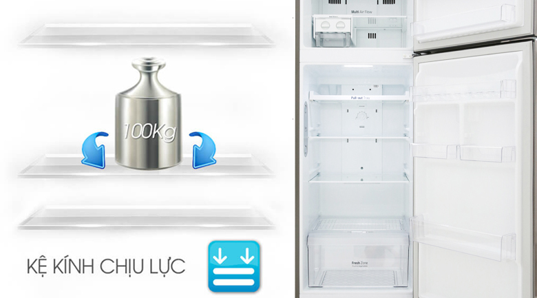 Ngăn kệ được thiết kế từ kính chịu lực vô cùng chắc chắn, chịu lực tốt, bạn có thể thoải mái lưu trữ thực phẩm mà không cần lo sẽ làm ảnh hưởng đến tủ.