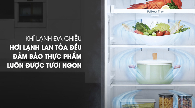 Hệ thống làm lạnh đa chiều từ mọi hướng, giúp thực phẩm được bảo quản đồng đều và tốt nhất. Hệ thống phân phối luồng khí thổi đều và mạnh, đến tất cả các vị trí trong tủ lạnh, cho thực phẩm làm lạnh đều được tươi xanh và không bị héo vì lạnh quá.