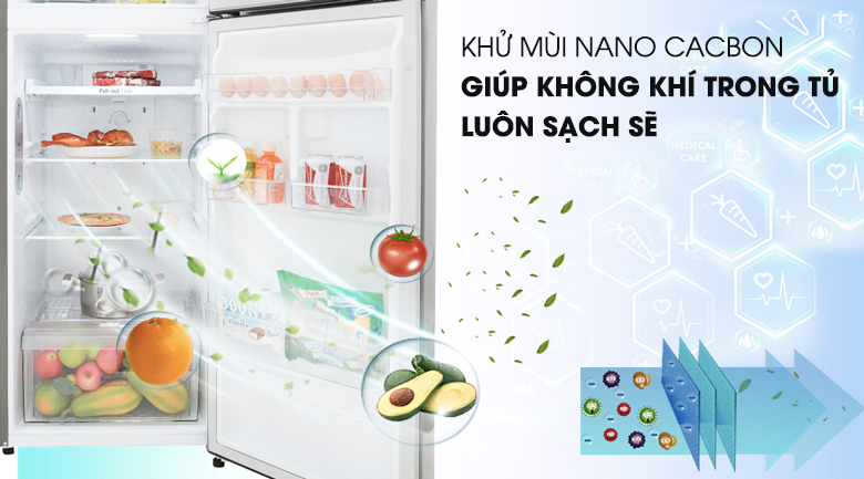 công nghệ Nano Cacbon có trên chiếc tủ lạnh Inverter này giúp kháng khuẩn và khử mùi cực mạnh nhờ các hạt Nano giúp loại bỏ hoàn toàn vi khuẩn, mùi hôi ra khỏi tủ lạnh giúp bảo quản thực phẩm tốt hơn, bảo vệ sức khỏe cho gia đình bạn.