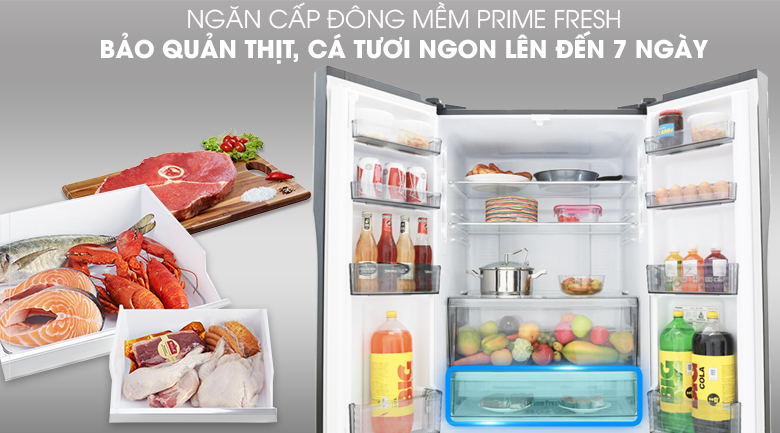 Công nghệ cấp đông mềm Prime Fresh sẽ giúp bạn tiết kiệm thời gian chế biến thức ăn vì không phải chờ rã đông, dễ thái cắt thực phẩm, không gây phát tán mùi khó chịu của thực phẩm, bên cạnh đó thực phẩm bảo quản trong ngăn đông mềm vẫn giữ được mùi vị và độ tươi ngon. Với công nghệ cấp đông mềm Prime Fresh bạn hoàn toàn có thể yên tâm bảo quản thịt, cá tươi ngon đến 7 ngày mà không lo bị hư hỏng hay mất chất dinh dưỡng