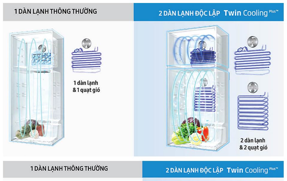 Tủ lạnh Inverter Samsung sử dụng hai dàn lạnh hoạt động độc lập, hai ngăn tủ của tủ lạnh Twin Cooling Plus hoàn toàn tách biệt, giúp ngăn việc mất độ ẩm từ ngăn mát sang ngăn đông do sự trao đổi khí giữa hai ngăn, giữ độ ấm tối ưu, giúp thực phẩm tươi ngon lâu hơn gấp 2 lần, không bị lẫn mùi. Và còn có thể điều khiển 2 ngăn riêng biệt nhờ 5 chế độ chuyển đổi linh hoạt: Chế độ 2 ngăn mát, chế độ tiết kiệm điện, chế độ du lịch và chế độ ngăn mát nhỏ.