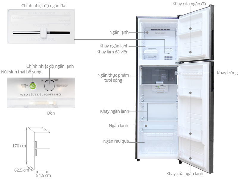 Tiện ích: Inverter tiết kiệm điện, Bảo quản thịt cá không cần rã đông, Ngăn kệ có thể thay đổi linh hoạt