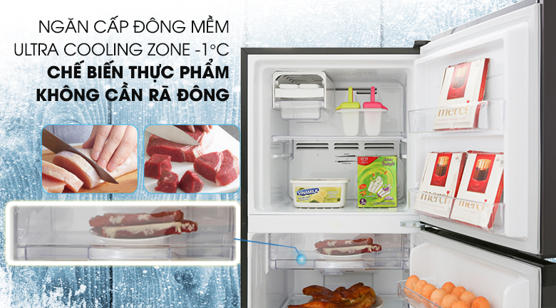 Một trong những ưu điểm phải nhắc đến ở chiếc tủ lạnh Toshiba này chính là thiết kế ngăn cấp đông mềm Ultra Cooling Zone -1°C giúp bảo quản thực phẩm tươi sống như thịt, cá,... của bạn luôn tươi ngon mà không lo bị đông đá. Nhờ vậy những món ăn sẽ luôn trọn vẹn hương vị thơm ngon và dinh dưỡng, đồng thời bạn không phải tốn thời gian chờ rã đông trước khí chế biến nữa. Tuy nhiên, ngăn này chỉ trữ được thịt cá ăn trong ngày thôi, nên nếu muốn trữ lâu hơn, bạn có thể dùng ngăn trữ đông nhé!