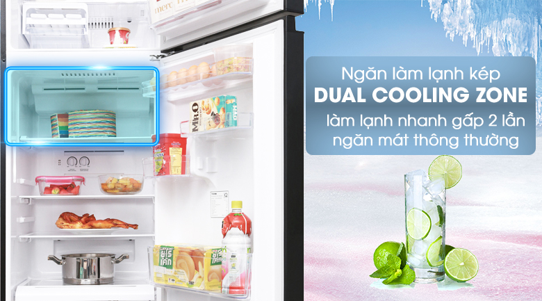 Ngăn làm lạnh kép Dual Cooling Zone của tủ lạnh Toshiba mang đến khả năng làm lạnh nhanh với thời gian ngắn hơn so với tủ lạnh thông thường khác. Điều này không chỉ làm lạnh thực phẩm nhanh chóng mà còn giúp bạn sẽ được thưởng thức những thức uống mát lạnh mà không phải chờ đợi quá lâu.