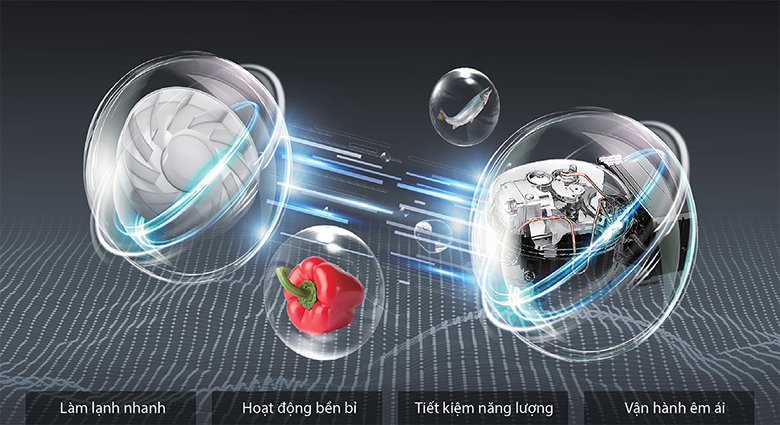 Cùng với quạt inverter, các khe thổi khí được bố trí phía trên và dưới giúp luồng khí lạnh đa chiều được thổi từ nhiều hướng làm lạnh nhanh chóng, đồng đều mọi ngóc ngách trong khoang tủ giữ thực phẩm tươi ngon. Giờ đây, tủ lạnh của bạn sẽ không còn tình trạng thực phẩm chỗ thì bị đóng băng do quá lạnh, chỗ lại nhanh hỏng do không đủ hơi lạnh, đồng thời không gây đóng tuyết như tủ lạnh đời cũ.