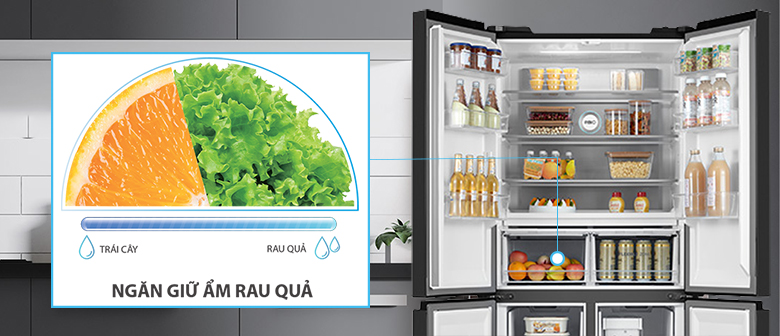 Ngăn giữ ẩm có 02 mức điều chỉnh độ ẩm tối ưu cho các loại quả, trái cây hoặc cho các loại rau lá giúp rau củ quả duy trì sự tươi ngon lâu dài, hạn chế khô héo, hao hụt vitamin do mất nước hoặc ngược lại quá ẩm khiến rau quả nhanh bị úng hỏng.
