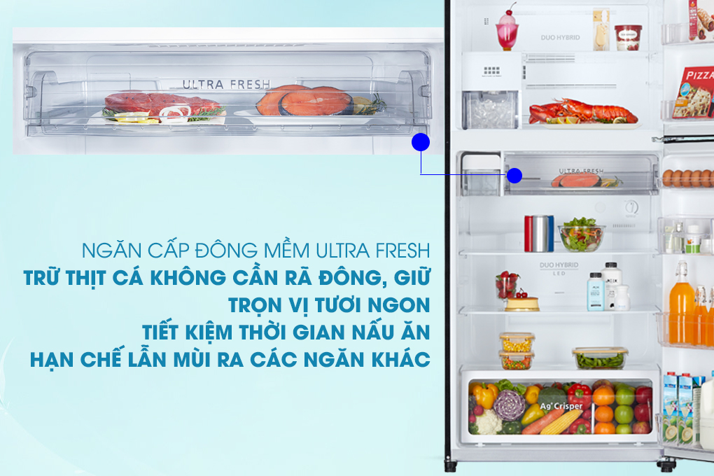 Giờ đây thịt cá bảo quản trong tủ lạnh của bạn sẽ được dễ dàng hơn với ngăn cấp đông mềm Ultra Fresh, ngăn đông mềm sẽ không làm thịt cá đóng băng như ngăn đá, có thể lấy ra chế biến ngay mà không cần rã đông, với nhiệt độ đông mềm - 3 độ C giúp thịt cá giữ nguyên được dưỡng chất và hương vị ban đầu.