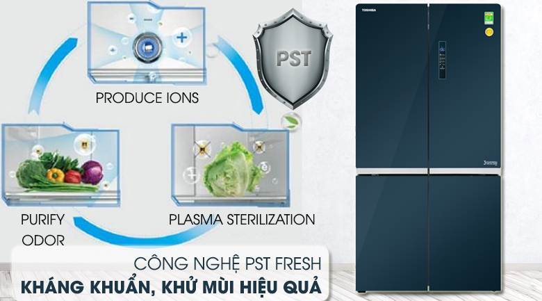 Ở chiếc tủ lạnh Toshiba GR-RF646WE-PGV, công nghệ PST Fresh có khả năng tạo ra các ion dương và ion âm trong môi trường không khí lạnh. Các ion này sẽ xâm nhập vào vi khuẩn và bề mặt tế bào vi sinh vật có ở bên trong tủ, gây mất khả năng hoạt động của chúng, giúp kháng khuẩn, khử mùi hiệu quả, trả lại bầu không gian trong lành, không bám mùi hôi khó chịu cho tủ lạnh.