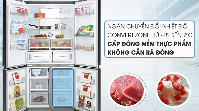 Ngăn chuyển đổi Convert Zone từ -18 đến 7 độ C tiên tiến của tủ Toshiba sẽ cho bạn nhiều không gian lưu trữ linh hoạt từ trữ đông đến trữ lạnh, đặc biệt là khả năng chuyển đổi thành ngăn đông mềm vô cùng tiện lợi.