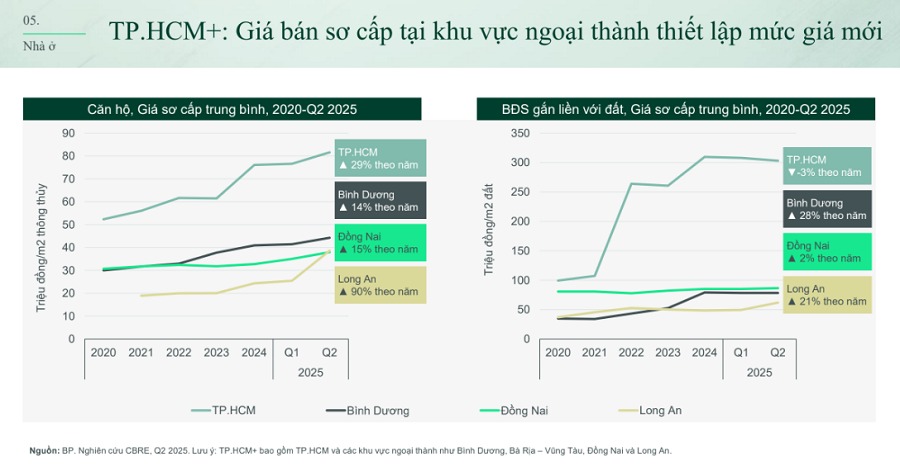 Theo CBRE, sự dịch chuyển từ lõi trung tâm ra các đô thị vệ tinh đã được phản ánh rõ qua giá bán. Trong khi TP.HCM ghi nhận mức tăng bình quân 29%/năm, thì các địa phương giáp ranh cũng tăng mạnh. Trong đó, Bình Dương (cũ) tăng 14%/năm, Đồng Nai tăng 15%/năm nhờ động lực từ sân bay Long Thành. Đáng chú ý, Long An (cũ) bứt phá tới 90%/năm, trở thành “điểm nóng” mới nhờ quỹ đất rộng và sự xuất hiện của các dự án đại đô thị.