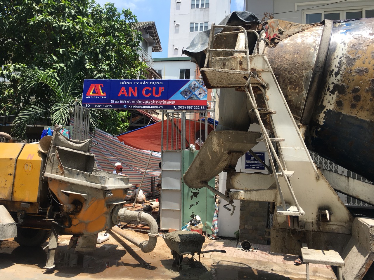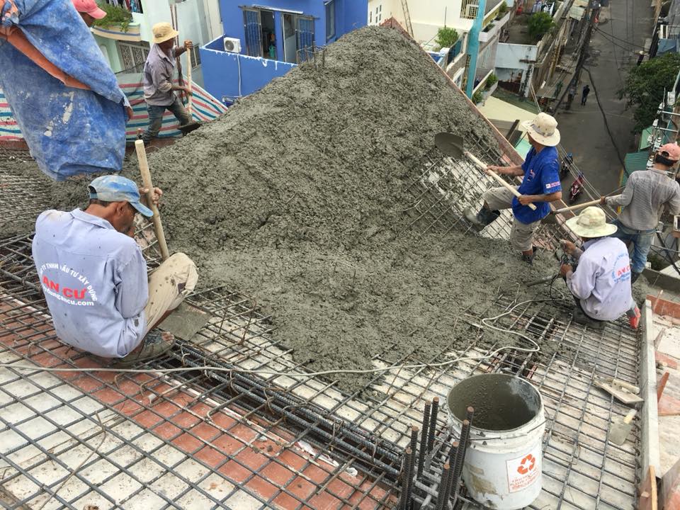 Tiến hành bơm bê tông tươi cất nóc, với AN CƯ nếu công trình thi công ở điều kiện đường lớn, đường không cấm xe tải thì tất cả các công đoạn bê tông đều sử dụng bê tông tươi với cường độ và chất lượng cao nhất nhằm đảm bảo an toàn kết cấu cho công trình tối đa 70-100 năm