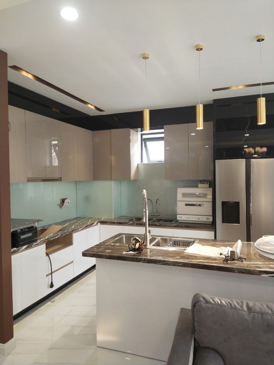 Nội thất phòng bếp và nội thất phòng ăn được thiết kế liên thông với nhau, giúp tạo sự thuận tiện trong quá trình sử dụng. Bên cạnh đó, tủ bếp sử dụng gỗ kết hợp với màu trắng của Acrylic nên sẽ giúp tạo điểm khác biệt cho không gian phòng bếp.
