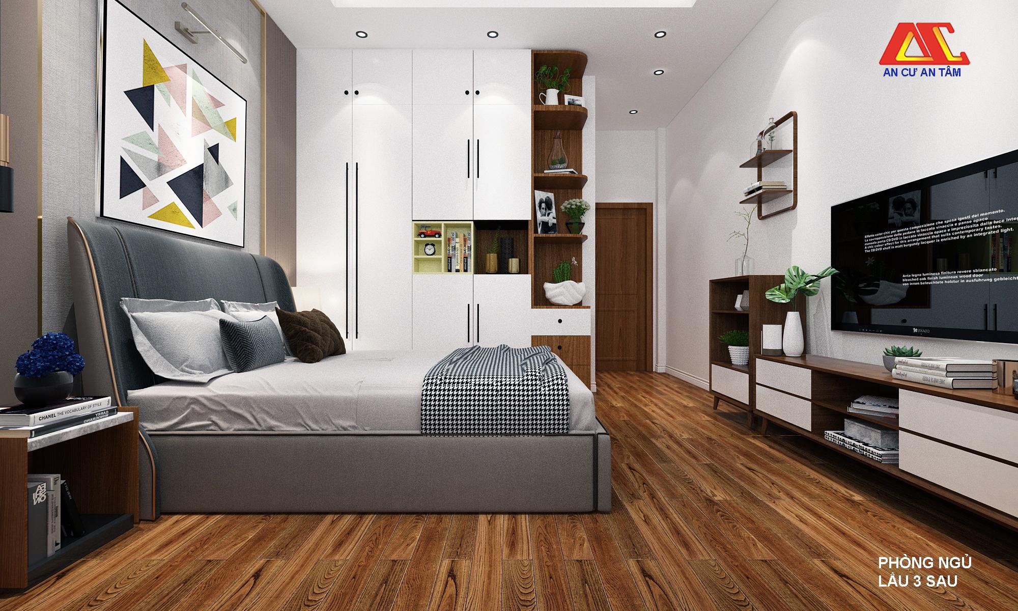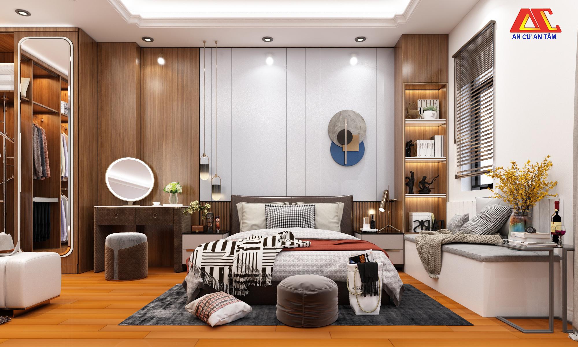 Phòng ngủ master cho bố mẹ được thiết kế theo phong cách hiện đại. Nội thất gỗ được sử dụng chủ đạo trong căn phòng này gúp đem lại cảm giác ấm cúng. Hệ tủ âm tường được thiết kế để cất trữ đồ đạc, quần áo đồng thời giúp tiết kiệm diện tích cho không gian phòng ngủ.
