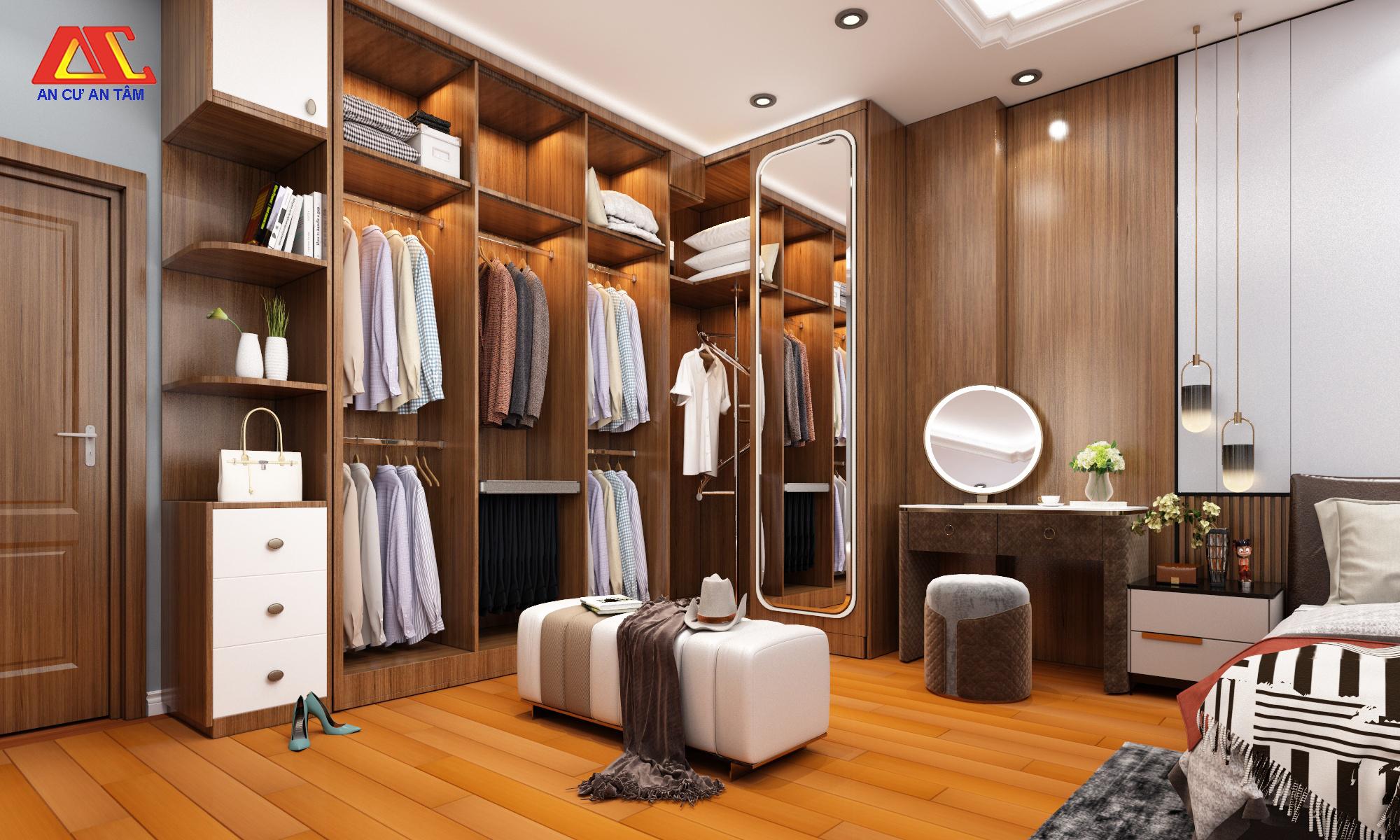 Thiết kế tủ quần áo gỗ cánh mở, có nhiều ngăn giúp để một số lượng lớn đồ đạc, quần áo cho gia chủ. Thiết kế tủ vừa hiện đại vừa giúp tiết kiệm tối đa diện tích cho căn phòng.
