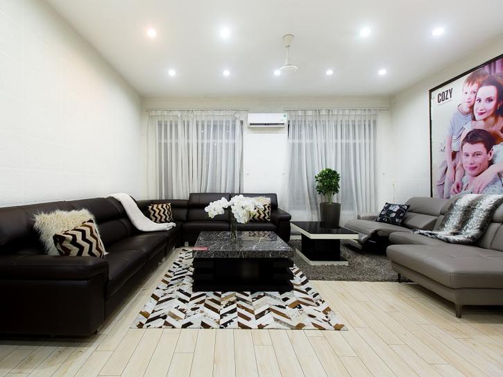 Không cần thể hiện quá nhiều, nội thất phòng khách cho mẫu thiết kế này rất đơn giản. Chỉ với bộ ghế sofa chữ L, bên cạnh là bàn trà mặt đá tinh tế cùng một thấm thảm trang trí bằng lông đầy ấm áp. Bên cạnh đó, phòng khách còn có sử dung rèm cửa trang trí cùng hệ thống đèn trần. Ngoài ra, phòng khách còn có thêm điểm nhấn là các gối ôm nhiều màu sắc, ghế bật thư giãn. Tất cả đó đã có thể hoàn thành sứ mệnh đem lại sự trang nhã cho không gian.