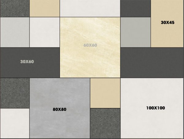 Gạch lát nền vuông có kích thước như: 30x30cm, 40x40cm, 50x50cm, 60x60cm, 80x80cm