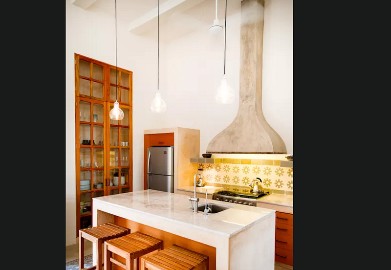 Tủ bếp dạng chữ L đã được sử dụng rộng rãi với những phòng bếp có không gian vuông vắn, nhưng kết hợp đảo bếp (tách 1 phần bếp tạo thành một bếp riêng nhỏ hơn trong không gian bếp) vẫn còn là 1 thiết kế ít được áp dụng do lo sợ không gian được bố trí không hợp lý, dẫn đến khó khăn trong lưu thông.