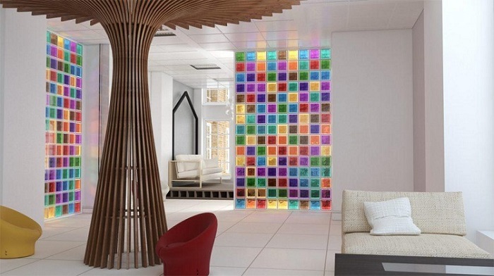 Những viên gạch kính màu sẽ làm tăng thêm sắc màu, sự lung linh cho căn phòng nhà bạn. Những lớp màu này được sử dụng công nghệ hiện đại nên có độ bền rất cao và không phai. Bạn có thể sử dụng đèn led dây để tăng thêm sự sinh động, thu hút người nhìn. Bên cạnh những khối gạch kính màu bề mặt trơn, bạn cũng có thể sử dụng những viên gạch kính màu có họa tiết hoa văn.