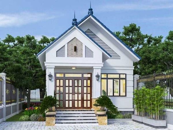 Phần mái đổ chữ An và dán ngói hoặc thay bằng tôn, xà gỗ sắt. Màu chủ đạo của mẫu nhà này là màu trắng. Phía sau có nhà vệ sinh, sân vườn, hàng rào, có thể lấy ánh sáng tự nhiên bằng cách làm hàng rào sắt, thậm chí có thể phơi quần áo cho gia đình.