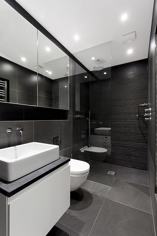 Nếu bạn một lần đặt chân vào không gian sở hữu thiết kế phòng tắm kết hợp cùng nhà vệ sinh đẹp với tone màu đen mạnh mẽ, bạn sẽ bất ngờ vì vẻ đẹp tuyệt vời mà nó mang lại cho toàn bộ không gian. Tone màu đen hiện hữu trên sàn và ốp tường cao đến gần trần nhà và những tấm kính lớn mang tới hiệu ứng thị giác đáng để trải nghiệm.