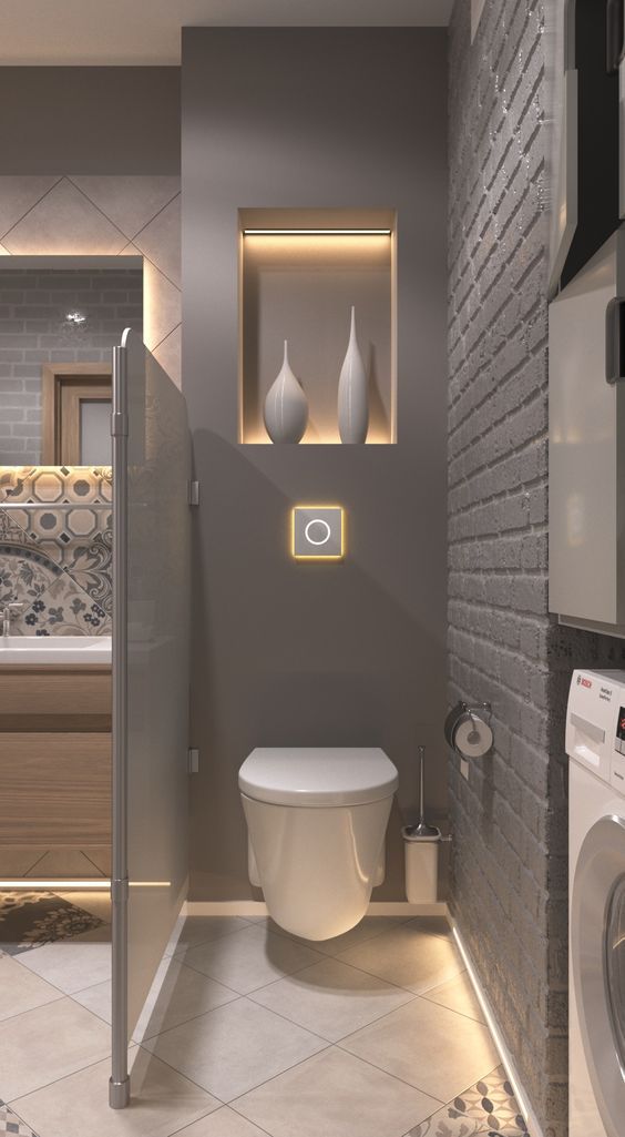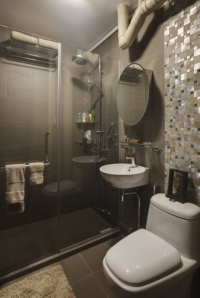 Sở hữu một diện tích nhỏ, mẫu thiết kế phòng tắm đơn giản kết hợp nhà vệ sinh được thiết kế một vách ngăn trang trí đơn giản. Gam màu nâu xám sẽ khiến không gian của phòng tắm và phòng vệ sinh thêm tinh tế và sang trọng hơn. Trong các thiết kế này, vật liệu trang trí cần được sắp đặt hài hòa nhằm mang tới sự tươi trẻ nhưng không khiến cảm giác khó chịu cho người dùng.