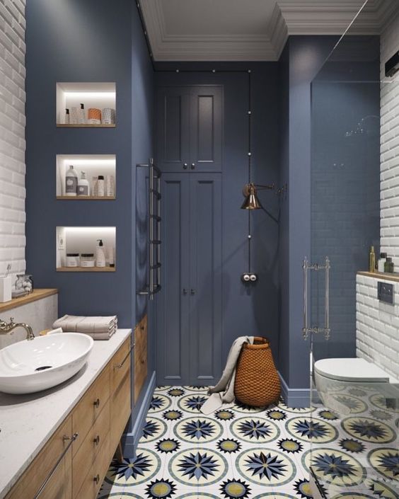 Mẫu thiết kế nhà vệ sinh đẹp và phòng tắm hiện đại này vẫn được ngăn cách bởi lớp cửa cửa nhà tắm bằng kính. Tuy nhiên, sự xuất hiện của nội thất nhà tắm bằng chất liệu gỗ ngay dưới bồn rửa mặt sẽ khiến sự vintage càng thêm rõ nét. Sàn gạch bông hoa văn tạo cảm giác sự mát mẻ cho căn phòng này. Đá lát sàn vệ sinh là những họa tiết đầy cảm hứng và cổ điển chắc chắn sẽ không khiến bạn thất vọng.