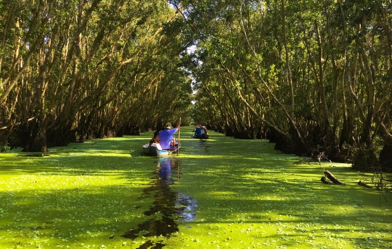 Ảnh đoàn khách trải nghiệm thuyền trong rừng tràm Trà Sư, An Giang